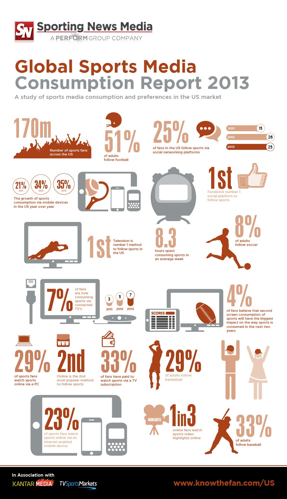 - Un 51% de los aficionados consumen contenidos sobre fútbol (americano), un 33% baseball, un 29% baloncesto y un 8% soccer (fútbol).